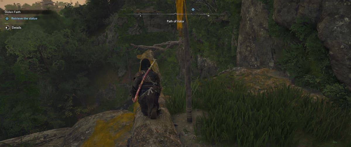 Begin your journey at a cliff edge, where you'll see two poles adorned with yellow cloth. Proceed forward and use your grappling hook to leap to the opposite cliff. Ascend the wall marked with yellow paint and continue straight, making a left turn once you've scaled the wall.