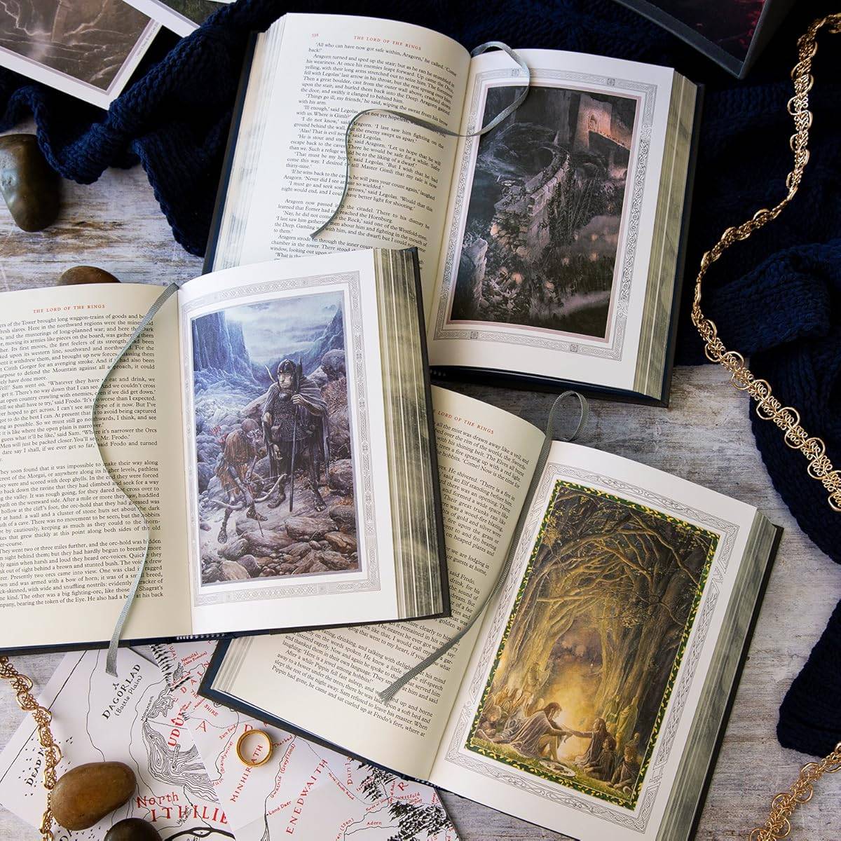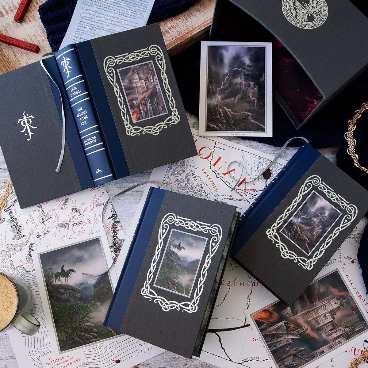 該盒子套裝包括《指環王》三部曲的所有三本書:戒指的團契,兩座塔和國王的歸來。將自己沉浸在艾倫·李(Alan Lee)的無數彩色彩色繪畫和無數鉛筆素描中。該修訂版為每本書提供新的封面藝術,以及幾幅新的繪畫和50多種其他鉛筆圖紙。該場景還包括三張可移動的藝術卡和兩張由克里斯托弗·托爾金(Christopher Tolkien)說明的中土地圖。