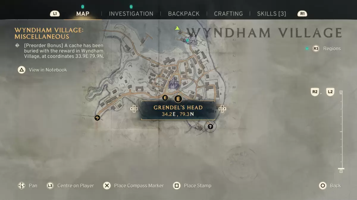 在您的調查菜單中跟踪第二個“埋藏寶藏”線索。該線索將解鎖“基本供應捆綁包”,位於坐標34.2e,80.2n的溫德姆村。在您的指南針上標記此位置以便引用。