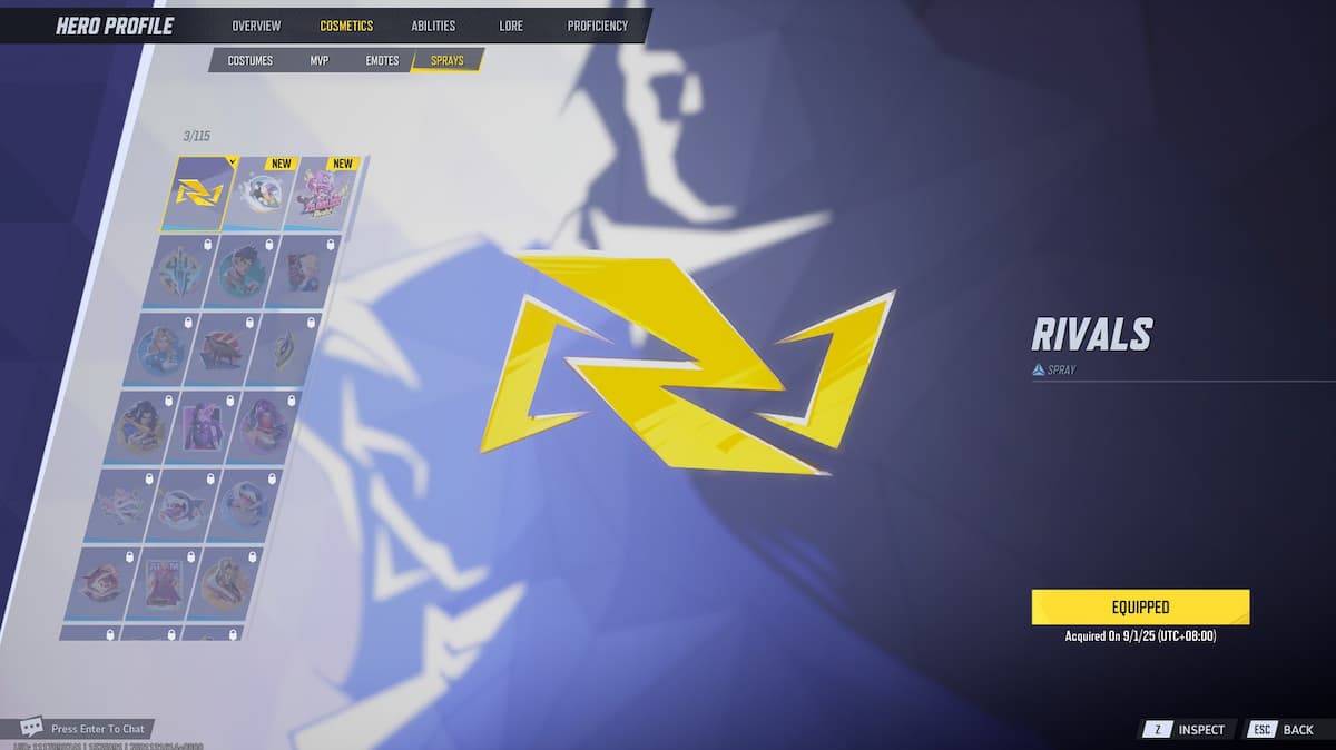 重要說明:您需要為每個角色分別裝備噴霧和情感。沒有全球設置可以在整個陣容中應用化妝品。要裝備它們,請從主菜單中導航到英雄畫廊,選擇您的角色,轉到“化妝品”選項卡,然後選擇“服裝”,“ MVP”,“ MOCKES”或“ ESOMES”或“ SPRAYS”,然後裝備您的收藏夾。