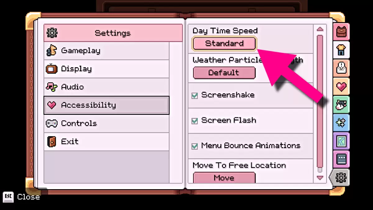 首先,请从主菜单中加载当前的游戏。回到农场后,打开暂停菜单,并在底部导航到**设置选项卡**(由齿轮图标表示)。从那里,从左侧下拉菜单中选择**'可访问性'**。您会在顶部找到**'白天的时间速度'**选项,最初设置为“标准”。